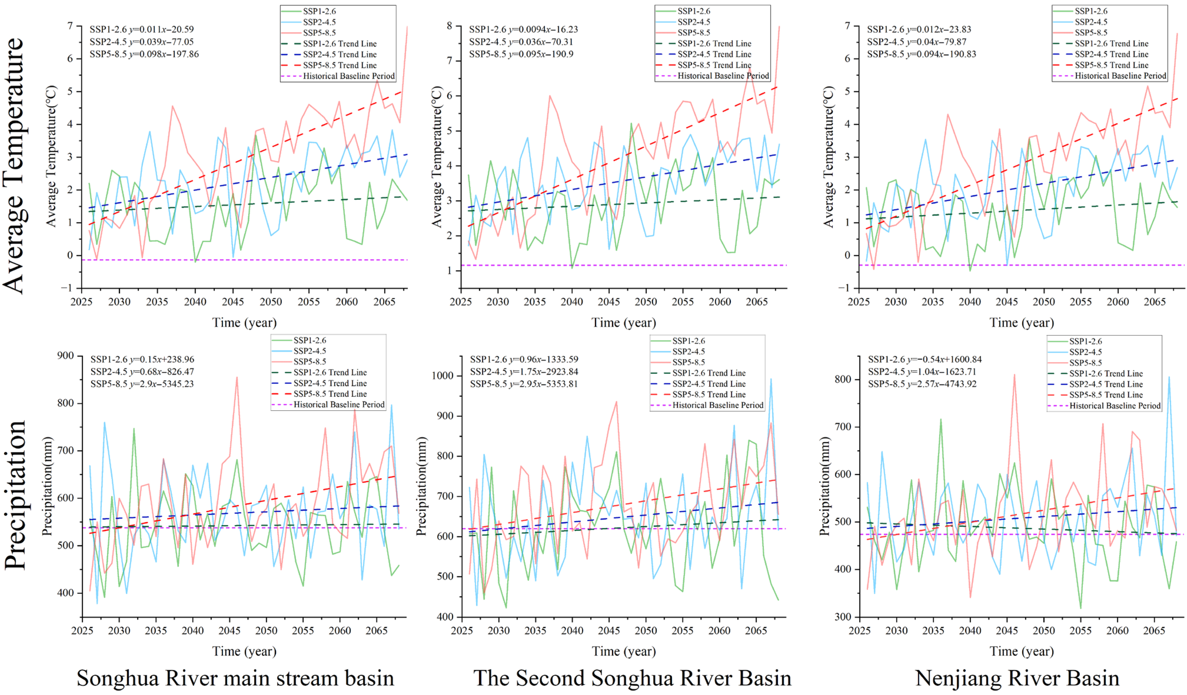 - Future projections indicate rising temperatures across all scenarios, with the most pronounced warming under high-emission pathways. Precipitation changes exhibit spatial heterogeneity, alongside increased probability of extreme rainfall events under higher emissions.