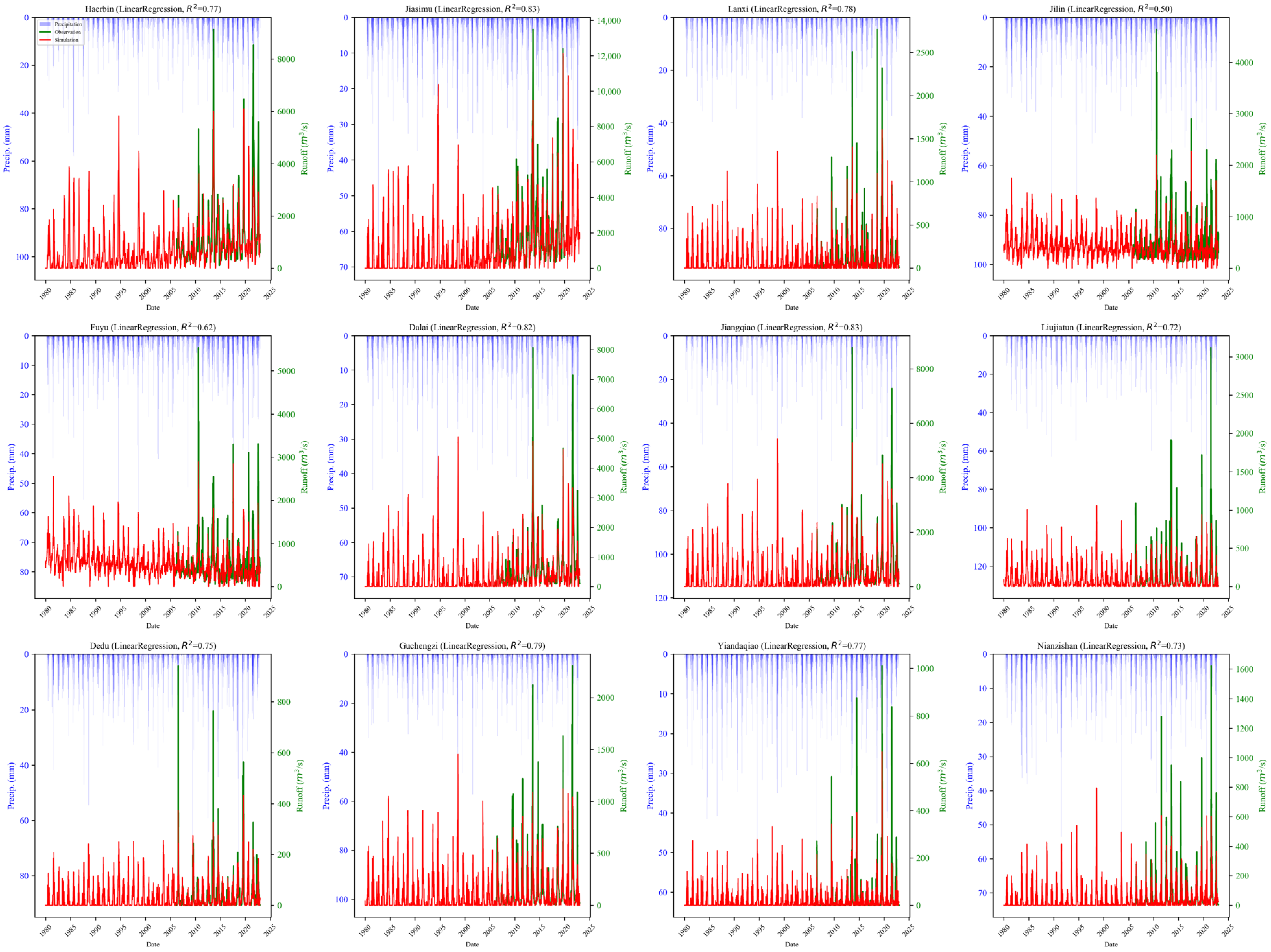 River discharge data | Actual measurement data from 12 hydrological stations in the Songhua River Basin, including Harbin, Jiamusi, Lanxi, Jilin, Fuyu, Dalai, Jiangqiao, Liujiatun, Dedu, Guchengzi, Yanqiao, and Nianzishan | 2006–2022 | Daily |