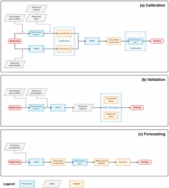 In Figure 2, research flowcharts are divided into (a) calibration, (b) validation, and (c) prediction stages. In (a), to identify the required discharges to meet the minimum specified flows at each gauge downstream, the model initially records the past releases from each dam (based on a predefined historical series of observed outflows recorded for Atibainha and Cachoeira reservoirs) and translates these hydrographs to the first encountered point using a method for river routing called the Muskingum model (towards downstream) [31,32]. Based on observed flows at the first stream gauge and water withdrawals for supply and consumption, a separation of components is performed to calibrate the parameters applied in the routing model jointly with the variables necessary for the rainfall–runoff conversion, which is calculated by a model called SMAP [33]. The technique employed to calibrate the increments of each process (routing and rainfall–runoff) corresponds to a differential evolution algorithm. The same procedure is then repeated between the first and second gauges; now, the observed flows registered in the first point are translated to the second point, whereby a new separation and calibration of variables is performed using the calculated flow increments via Muskingum and SMAP. With the hydrologic model properly adjusted, it is then necessary to adapt the backwater parameters for application in the reverse Muskingum routing scheme (which moves upstream, from outlet to inlet hydrographs).