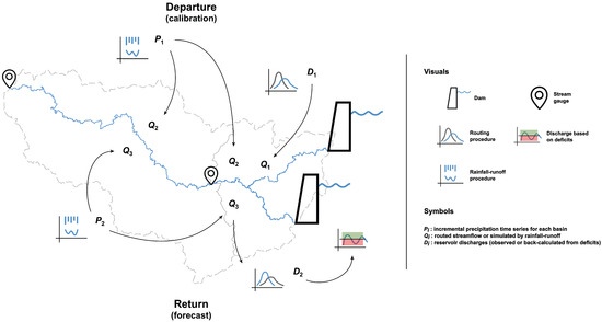 Finally, in (c), a 7-day series of meteorological forecasts is used to feed the rainfall–runoff module, backtracking to the source reservoirs, and comparing the hydrographs obtained with the demands specified by the water use permits. The release required to ensure downstream water security corresponds to the largest positive difference between the forecasted future flow and the daily minimum flow. To complement the flowcharts and visually represent the processes, Figure 3 shows an explanatory illustration.
