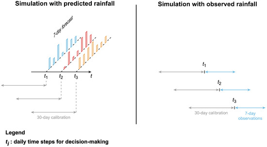 As aforementioned, the coupled model was structured to receive a set of seven meteorological forecasts at each step, used to convert into future streamflow values to be evaluated for compliance with local water resource permits. The dam release decision routines follow the following pattern: at each iteration, 30 days of observed data are used as modules inputs, as even after the 6-year calibration that determines the SMAP variables and Muskingum routing (both downstream and upstream), it is still necessary to initiate the rainfall–runoff algorithm with an initial soil moisture content () and a base flow (). In other words, a quick calibration is performed using 1 month of observed data. After this, at the end of each 30-day series, a vector of 7 days of future rainfall is added. With the set of days and the determined initial parameters, the prediction and backtracking of hydrographs to the source reservoirs are simulated. Note that at each step, the 7-day forecast vectors are renewed, as the data for each iteration is different and not repeated. As the objective of this article is to also vary the input forecasts, a scenario was prepared in which the rainfall predictions are observed rainfall measurements from the rain gauge stations. Thus, a situation was constructed where the 7-day future vectors are populated with observed rainfall data from each sub-basin. In this new approach, the dataset is entirely based on observed data and is simply shifted forward by one day at each iteration (therefore, the ‘forecast’ datasets include repeated data between steps). For more details, see Figure 5.