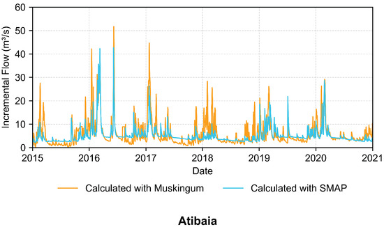 The calibration of parameters conducted over the 6-year dataset indicated Nash–Sutcliffe coefficient values of 0.541 and 0.581 for Atibaia and Valinhos, respectively, according to Figure 6 and Figure 7. It is possible to observe upper flow limits of about 50 m3s−1 at Atibaia and nearly 150 m3s−1 at Valinhos, with differences directly related to the total drainage area at each point. Because the incremental series derived from routing are more strongly influenced by observed data, whereas those obtained via SMAP depend mostly on the calibrated parameters, the orange peaks (Muskingum) tend to be sharper and more frequent than the blue ones (SMAP). Validation of calibrated parameters over a four-year period (see Figure 8 and Figure 9) yielded a Kling–Gupta efficiency (KGE) of approximately 0.38.