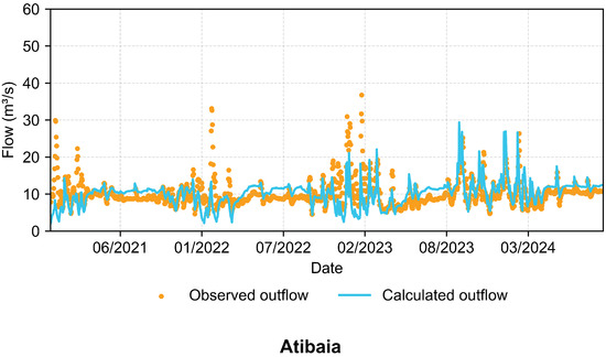The model’s low sensitivity to peak flows, as indicated by modest NSE and KGE values, are consistent with the findings of [49], which limits its suitability for flood-related applications. However, its reliable simulation of recessions supports its use in drought mitigation and reservoir management. Comparing Figure 6 and Figure 7, the markedly different peak magnitudes arise from the incremental rainfall contribution across the sub-basins associated with each control point. Because Valinhos drains an area more than twice the size of Atibaia, the rainfall–runoff component exerts a stronger influence on the calibrated hydrograph there. The same pattern is observed during validation (Figure 8 and Figure 9), where peak underestimation at Valinhos is more evident, consistent with the SMAP model’s behavior.