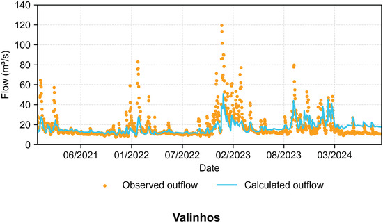 Whereas Figure 8 indicates a stronger correspondence between observed and simulated flows, Figure 9 for Valinhos shows greater divergence and underperformance. Peak discharges during the wet periods of 2022 and 2023 were not adequately reproduced, which depresses the KGE value.