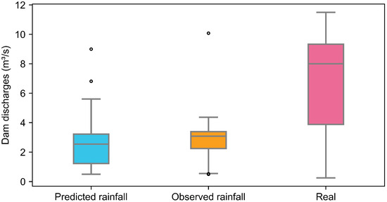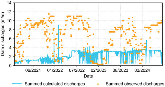 As shown in Figure 10, the model reduces the decision discharges to values lower than those observed. This nature is inherent to the coupled model and the way it operates the reservoirs. In real situations, compliance with water permits must be reconciled with the maneuvering times of hydraulic gates and with the flood propagation time to downstream sections. Although the model considers the second condition, it does not maintain constant maneuvers. Therefore, the discharges oscillate more frequently. Mathematically, the simulation aims to comply with the rules imposed as boundary conditions. When the highest average daily minimum is met in a rainfall–runoff step, the reservoirs release the minimum amount prescribed in the permit of 0.25 m3s−1. If the given day indicates the need for releasing a greater water volume, the model responds with automatic discharges that can jump from 0.25 to 1.50 m3s−1, for example, or higher.