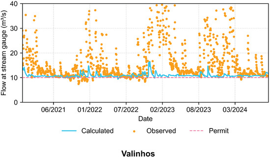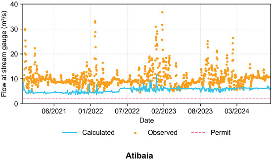 In the simulated gauge sections, as seen in Figure 11 and Figure 12, it is possible to observe that the hydrographs of the calculated flows align with the minimum expected flows at each point. As the calculated hydrographs in blue result from the translated discharged flow to the section plus the rainfall–runoff component derived from predicted rainfall minus water withdrawals, corresponding flow peaks can be observed during wet periods, as expected. Conversely, during drier conditions, the discharge is responsible for meeting the minimum flow requirements. Given that the calculated curve does not cross the dashed permitted line on any simulation day in Atibaia, the model ensured at least the minimum required flow throughout all the simulated days. In Valinhos, the flow requirement was unmet for 25 days over 4 years, with a minimum flow of 9.4 m3s−1. Despite a lower total compliance of 98%, the minimum water guarantee is still practically ensured at the simulated point.