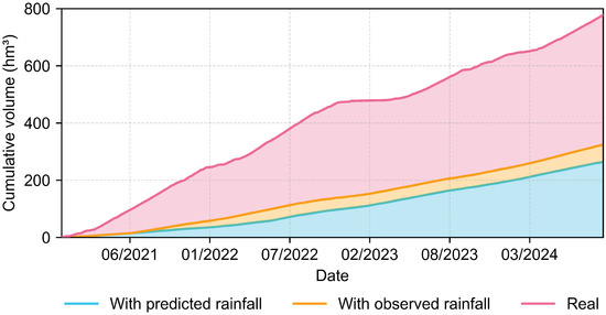 To avoid redundancy, one way to add the results in the observed rainfall scenario and contrast the simulations with forecasts, observations, and real data over the 4-year period is to calculate the area underneath each generated hydrograph and, thus, assess the accumulated discharged volumes (see Figure 13).