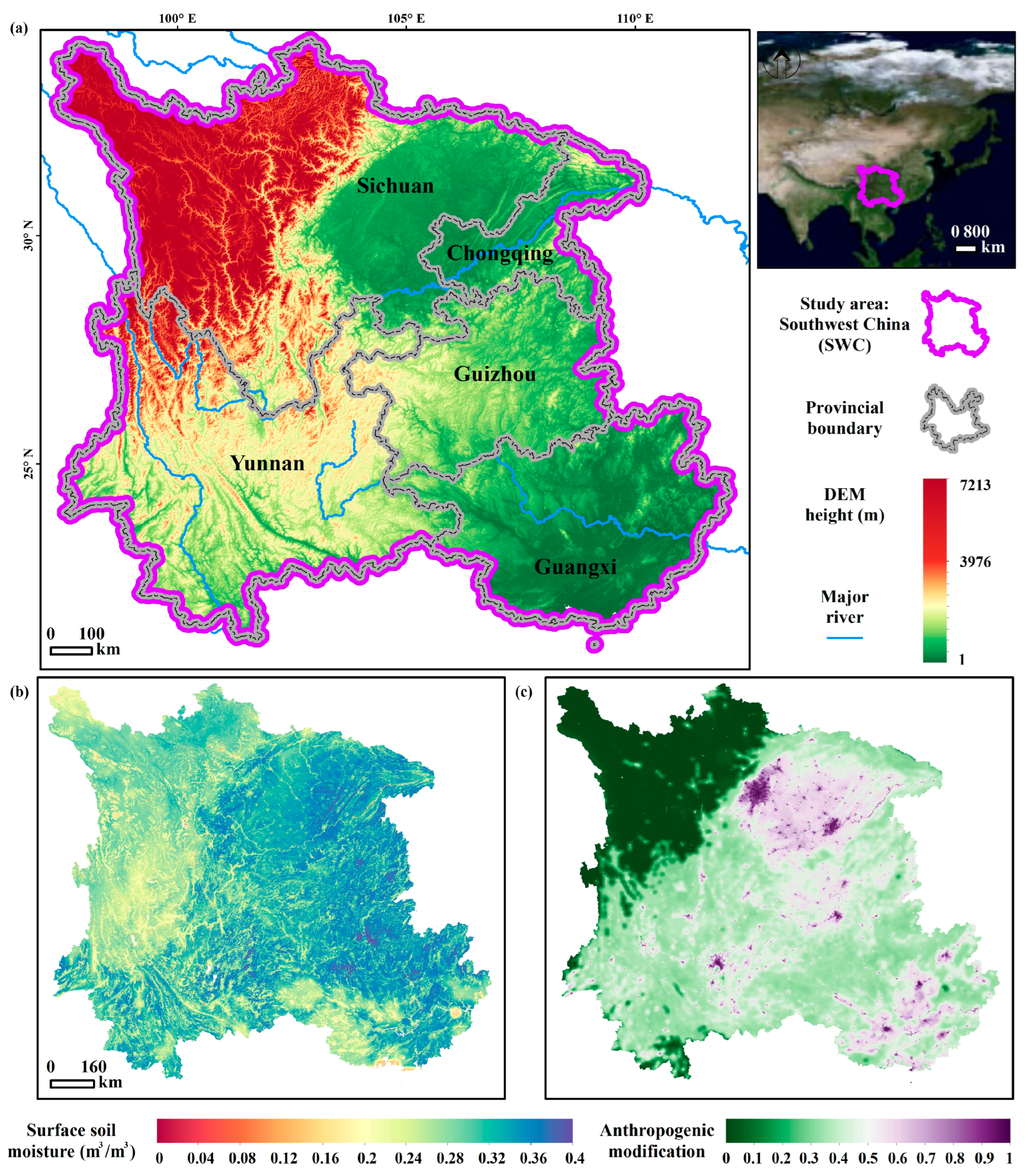 APA StyleShen, C., Qin, C., Lu, Z., Ning, D., Zang, Z., Tang, H., Pan, F., Cheng, G., Hu, J., & Meng, S. (2025). Assessing Impacts of Anthropogenic Modification on Surface Soil Moisture Dynamics: A Case Study over Southwest China. Hydrology, 12(11), 275. https://doi.org/10.3390/hydrology12110275