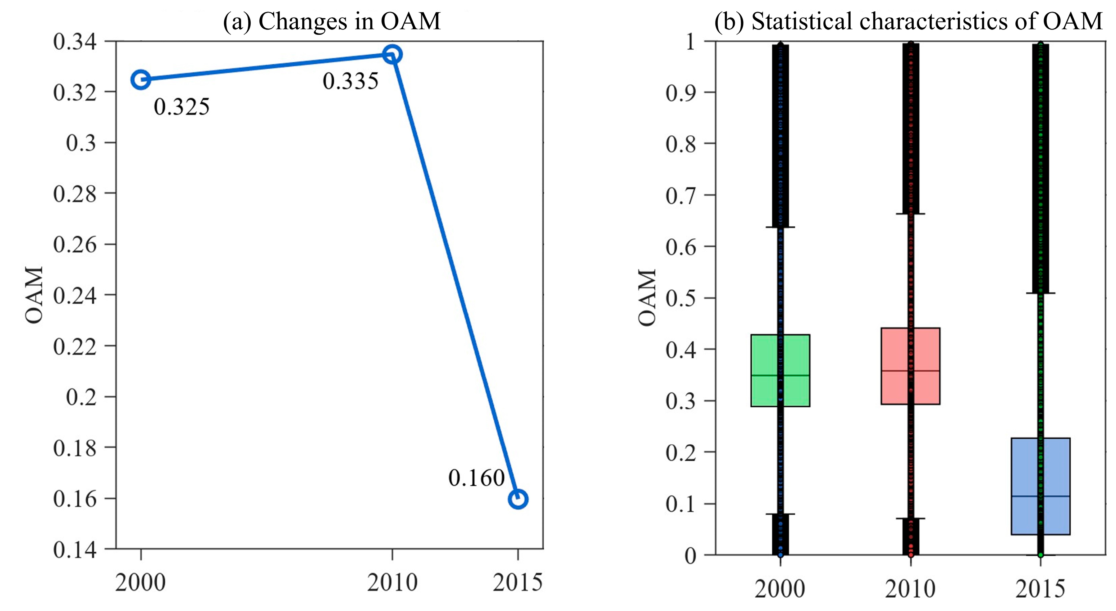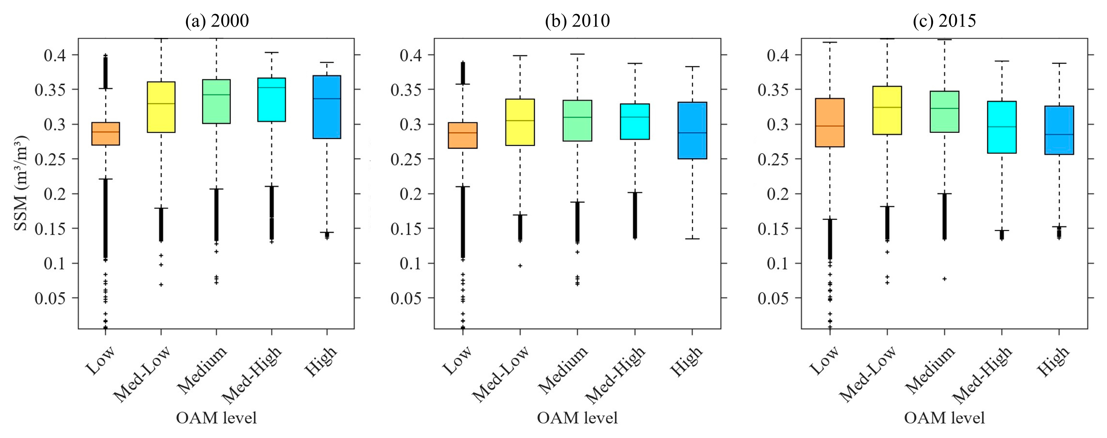 - Our analysis revealed distinct spatiotemporal patterns for both variables. The SSM exhibited persistent spatial heterogeneity, with wetter conditions in the north and northwest and drier conditions in the southeast. Temporally, a slight long-term declining trend (Sen’s slope = −0.0009 m3/m3/year) was observed, characterized by a decrease until ~2011 followed by a gradual recovery. Concurrently, OAM showed a complex non-monotonic trend, intensifying and expanding until 2010 before undergoing a significant decline by 2015. This inverse trajectory post-2010 suggests that large-scale environmental policies, such as the environmental protection projects and Grain-for-Green Program, may have effectively mitigated human pressure, subsequently facilitating a recovery in regional soil moisture conditions.