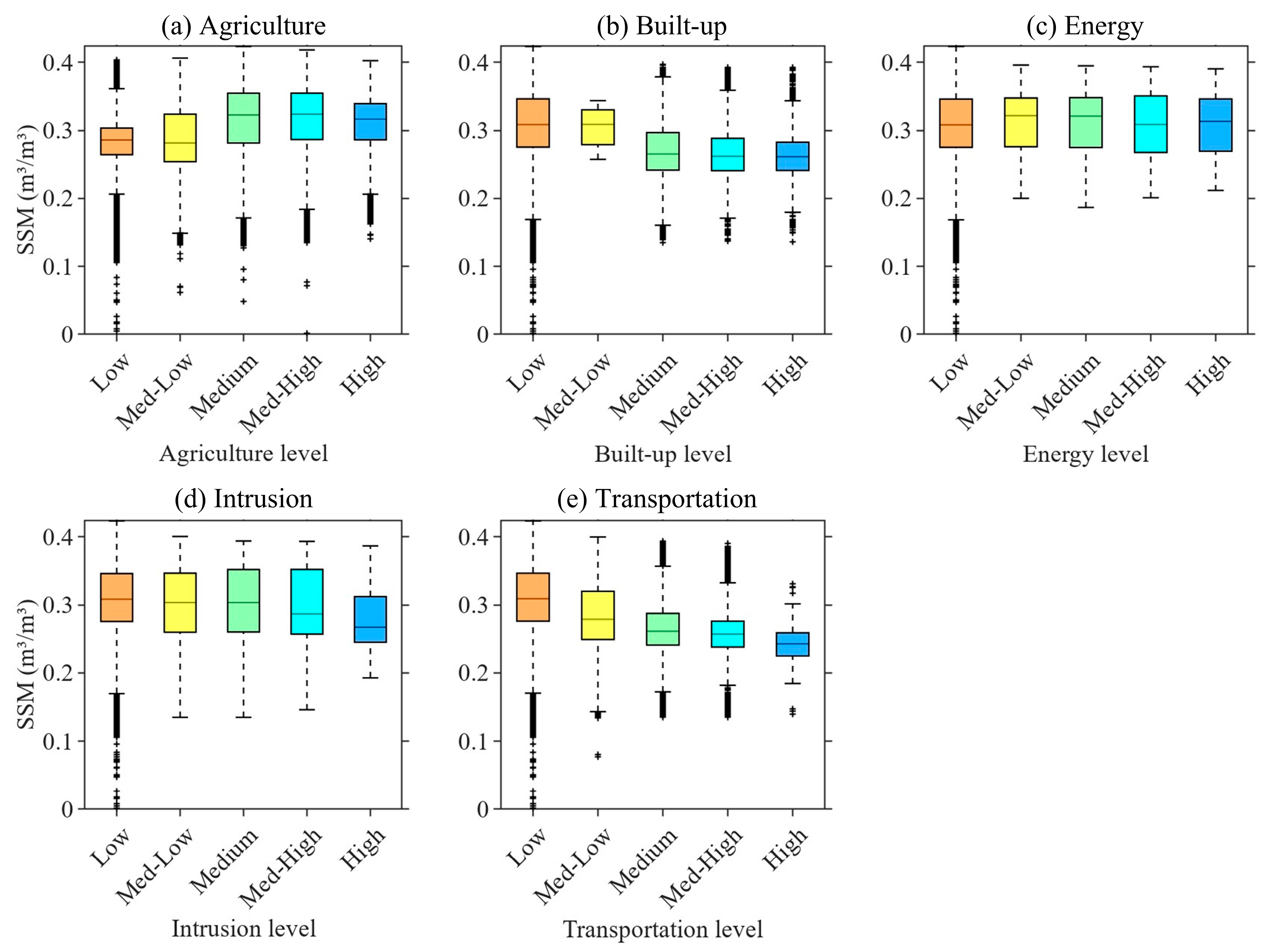 - The differentiated response patterns across stressor types demonstrate that aggregated human footprint indices are insufficient to interpret hydrological impacts. Agricultural modification enhances SSM, while transportation and energy-related disturbances suppress soil moisture, and built-up land reduces spatial variance without a linear effect on median moisture levels.