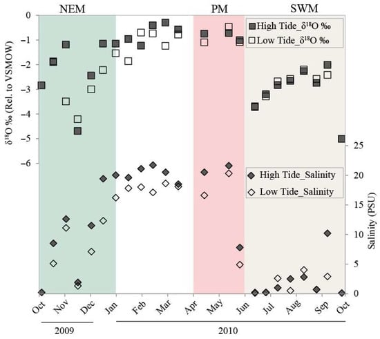 The top panel shows high and low tide water δ18O, while the bottom panel shows salinity data of the collected water samples. Filled and hollow squares represent δ18O values of high and low tide, respectively. Filled and hollow diamonds represent salinity values of high and low tide, respectively (Green Region—NEM; Light Pink—PM; Gray—SWM).