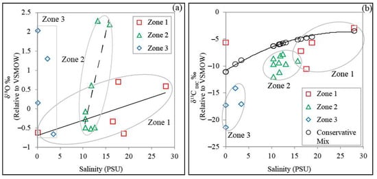 (a) δ18O–salinity relationship indicating three different spatial zones for collected Premonsoon samples depicted by hollow red squares, green triangles, and purple diamonds representing δ18O and salinity values from Zones 1, 2, and 3, respectively. (b) δ13C–salinity relationship of the spatial zones along with the conservative mixing curve. Hollow red squares, green triangles, and purple diamonds represent δ13C and salinity values from Zones 1, 2, and 3, respectively, while hollow black circles and the corresponding dotted line represent the conservative mixing curve. The grey circles in both (a,b) refers to the identified zonation’s in the estuary.