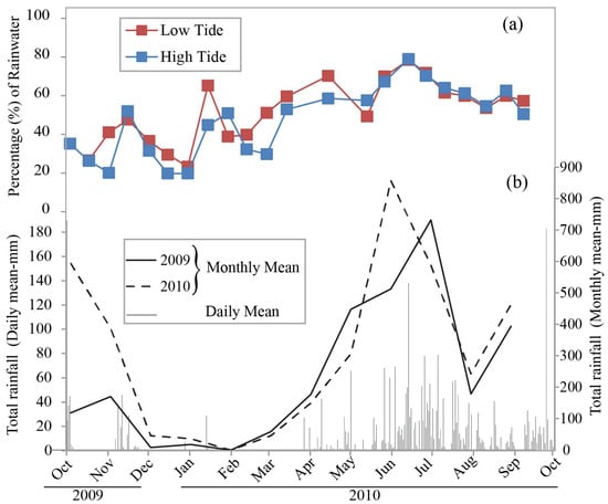(a) Relative contribution of freshwater to the Cochin Backwater at different times of the year calculated using the δ18O of the freshwater end member and seawater. Red and blue squares represent the percentage of rainwater at low and high tide, respectively. (b) Monthly (continuous and broken black line) and daily (gray) mean rainfall in mm.