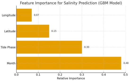 Feature importance for salinity prediction. The relative importance of predictor variables as determined by the Gradient Boosting Machine (GBM) model. Importance is calculated as the mean decrease in impurity; higher values indicate greater importance.