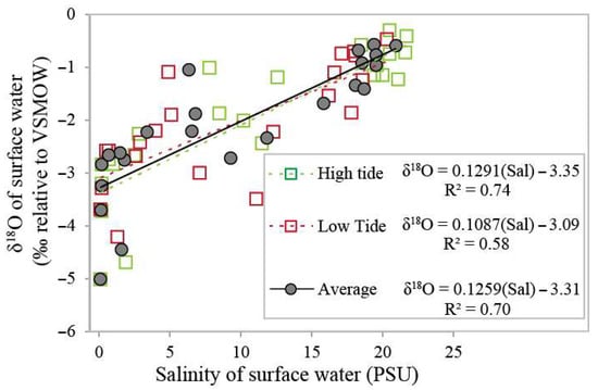 Correlation plot between δ18O and salinity in the collected CBW samples indicating the mixing between freshwater and saline water (VSMOW—Vienna Standard Mean Ocean Water). Hollow green and red squares represent δ18O and salinity values of high and low tide, respectively, whereas filled gray circles represent the average value.