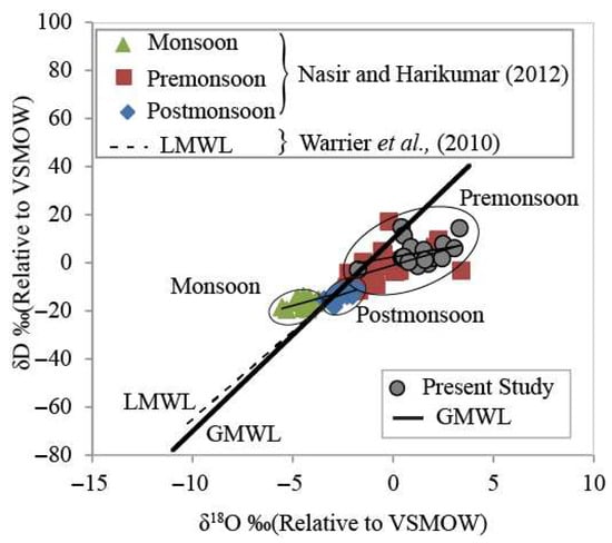 Comparison of the δ18O–δD regression line based on 18 Premonsoon surface water samples (Table 1) collected and compared with the Global Meteoric Water Line (GMWL) and Local Meteoric Water Line (LMWL) from published literature (Nasir and Harikumar, 2012 [] and Warrier et al., 2010 []).