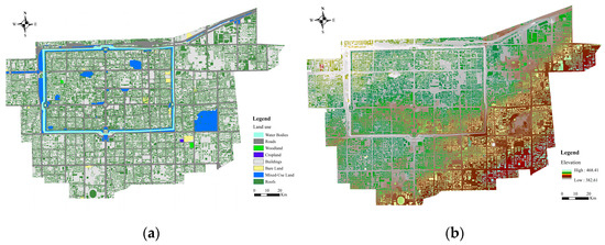 A surface runoff and river network routing model for the drainage sub-catchments of the Xi’an Moat was developed based on the GAST model. The underlying surface data, including land use and high-resolution digital elevation model (DEM) data, were provided by the Xi’an Municipal Institute of Surveying and Mapping. The DEM has a spatial resolution of 5 m (Figure 3a), and land use is classified into eight categories (Figure 3b): water bodies, roads, woodland, cropland, buildings, bare land, mixed-use land, and roofs. The study area covers 34.27 km2, and the model is discretized into 2.444 million grids with a resolution of 5 m.
