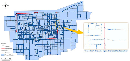 An urban underground drainage network model was constructed based on SWMM, with pipe network data provided by the Xi’an Municipal Institute of Surveying and Mapping. The model consists of 5569 nodes, one outlet, and 5570 conduits, including 5452 circular pipes and 118 rectangular box culverts. Stormwater outside the moat is conveyed through the drainage system into the outer box culverts at 27 junctions, while stormwater inside the moat is discharged into the inner box culverts at 18 junctions. The layout of the drainage network is shown in Figure 4. Both circular pipes and box culverts are made of reinforced concrete.