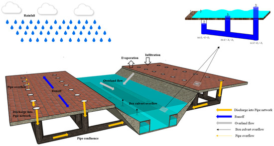Moreover, constrained by spatial limitations and construction conditions, drainage system upgrades in many old urban districts can only be implemented locally, resulting in multi-level drainage systems composed of pipelines, box culverts, and river networks. The hydraulic processes within these systems are highly complex, with frequent water exchanges among pipelines, box culverts, open channels, and the surface, resulting in dynamic and heterogeneous drainage pathways. Box culverts, in particular, are large drainage structures commonly found in historic city centers. Their hydraulic behavior differs markedly from both conventional pipelines and natural river channels, exhibiting pronounced transient flow characteristics [23,24]. Nevertheless, many existing models simplify them as enlarged pipes, neglecting their unique storage capacity and flow dynamics, which can compromise simulation accuracy.