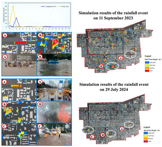 Rainfall events on 29 July 2024, and 11 September 2023, were selected to validate the coupled model by comparing simulated inundation locations with observed waterlogging points. On 29 July 2024, the total rainfall was 37.9 mm, with a duration of 19 h and a maximum rainfall intensity of 26.7 mm/h. On 11 September 2023, the total rainfall was 74.2 mm, with a duration of 10 h and a maximum rainfall intensity of 61.8 mm/h. The rainfall events and inundation locations are shown in Figure 6, and the simulated water depths compared with observations are summarized in Table 2. For the 11 September 2023 rainfall event, the average relative error between simulated and observed water depths was 4.7%, with a maximum relative error of 6.7%. For the 29 July 2024 event, the average relative error was 5.8%, with a maximum relative error of 10.0%. It can be observed that, for the rainfall events considered, the 1D–2D coupled model developed in this study can reliably simulate rainfall–runoff and inundation processes. The simulated inundation locations closely match the observed waterlogging points, and the relative errors in water depth are all within 10.0%, indicating that the model is capable of effectively reproducing urban rainfall and flood processes.