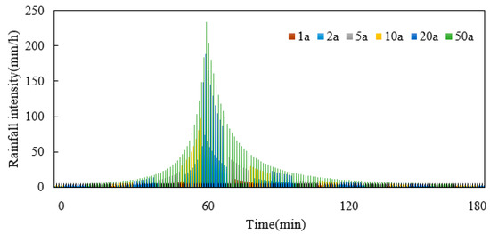 Rainfall events with 1-, 2-, 5-, 10-, 20-, and 50-year return periods and a duration of 3 h were designed, and the corresponding hyetographs are shown in Figure 7. The total rainfall depths corresponding to the 1-, 2-, 5-, 10-, 20-, and 50-year return periods (with a duration of 3 h) are 13.57, 25.49, 41.24, 53.16, 65.07, and 80.82 mm, respectively. The associated peak rainfall intensities are 39.24, 73.68, 119.20, 153.64, 188.07 and 233.59 mm/h, respectively.