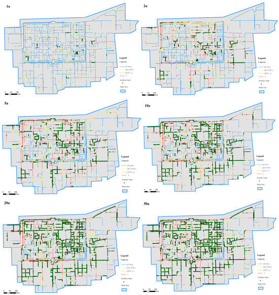 The drainage performance of the pipe network under different rainfall return periods is presented in Table 3. For the six design rainfall scenarios, the total drainage volumes in the study area were 14.99 × 104, 24.69 × 104, 28.41 × 104, 30.47 × 104, 31.72 × 104, and 33.18 × 104 m3, respectively. The proportions of pipes reaching full capacity (fill ratio = 1) increased with return period, being 8.85%, 27.49%, 47.48%, 57.25%, 65.31%, and 72.06%, respectively. Similarly, the percentages of nodes experiencing overflow were 4.38%, 19.11%, 38.46%, 51.39%, 60.12%, and 65.29%, with corresponding total overflow volumes of 0.57 × 104, 9.95 × 104, 28.16 × 104, 58.66 × 104, 86.35 × 104, and 93.29 × 104 m3. As shown in Figure 8, the spatial distribution of overflow nodes and fully loaded pipes varies significantly with rainfall return period. Under low return period events, most pipes have fill ratios below 0.5, and only a few nodes experience overflow, primarily concentrated in areas where the drainage system is heavily loaded, which reach the overflow threshold first. As the return period increases, the number of fully loaded pipes rises, overflow becomes more widespread, and total overflow volumes increase substantially.
