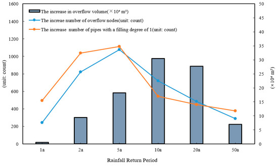 Increases in overloaded pipes, overflow nodes, and total overflow volume under different rainfall return periods.