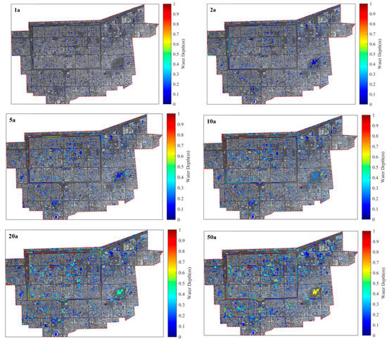 According to statistics, the maximum surface water ponding areas under different rainfall return periods are 1.23 × 104, 7.50 × 104, 26.54 × 104, 33.29 × 104, and 47.02 × 104 m3, respectively. The surface flooding conditions are shown in Figure 10. Under the 1a return period, only slight ponding occurs in some areas. Starting from the 2-year return period, the flooded area increases significantly, which is consistent with the conclusions from the pipe network drainage capacity analysis.