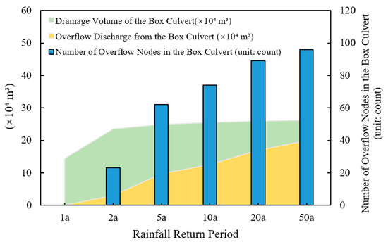 As shown in Figure 11, under the 1a rainfall scenario, the box culverts operate normally with no overflow. Starting from the 2-year return period, overflow begins to occur, and the proportion of overflow nodes increases significantly to 19.49%. Regarding the culvert discharge, the increase from the 2- to 50-year scenarios is limited (from 23.52 × 104 m3 to 25.85 × 104 m3), indicating that the culvert capacity is nearly saturated. As rainfall intensity further increases, the excess water beyond the culvert’s capacity is discharged as overflow, resulting in a continuous rise in both the number of overflow nodes and the total overflow volume, reaching 81.36% and 19.91 × 104 m3, respectively, under the 50-year return period.