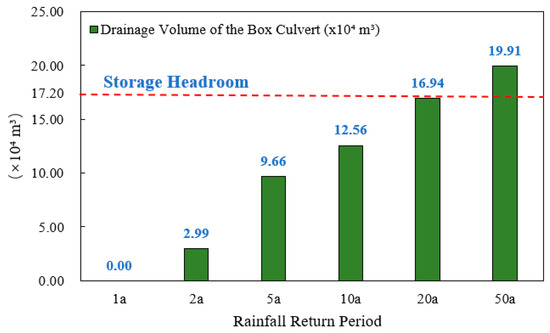 The moat in the study area, functioning as a dynamic flood-regulating facility, was evaluated under design rainfall events with 1-, 2-, 5-, 10-, 20-, and 50-year return periods and a duration of 3 h, in order to assess its flood storage and regulation performance across different scenarios. As shown in Figure 12, the volume of water overflowing from the box culverts into the Moat increases steadily with rainfall intensity, reaching 0.00, 2.99 × 104, 9.66 × 104, 12.56 × 104, 16.94 × 104, and 19.91 × 104 m3, respectively. Under normal conditions, the Moat maintains a landscape water level corresponding to a storage volume of approximately 127.5 × 104 m3, while its total designed flood storage capacity is 144.7 × 104 m3, leaving an available flood storage space of 17.2 × 104 m3. Based on the overflow data, under the 5-year return period, the box culvert overflow is 9.66 × 104 m3, which is below the Moat’s available storage capacity. For the 10-year return period, the overflow increases to 12.56 × 104 m3, approaching but not exceeding the storage limit. Under the 20-year return period, the overflow reaches 16.94 × 104 m3, nearly fully occupying the available storage. In the 50-year return period, the overflow rises to 19.91 × 104 m3, clearly exceeding the Moat’s flood-regulating capacity.