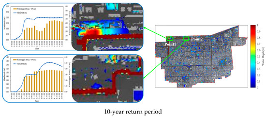 Area of water accumulation at flooding points for 10- to 50-year return periods.