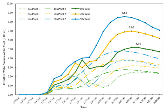 Based on the surface water inundation simulation results (Figure 10 and Figure 13), the moat begins to overflow under the 10-year return period rainfall. This indicates that although the box culvert overflow under the 10-year rainfall does not exceed the moat’s flood storage capacity, the total inflow into the moat—including direct surface runoff and box culvert overflow—already surpasses its storage limit, leading to overtopping. As the rainfall return period increases, both the overtopping volume (at Points 1 and 2) and the inundated area increase significantly (Figure 14 and Figure 15), reaching 5.19 × 104 m3, 7.00 × 104 m3, and 8.59 × 104 m3 in volume, and 8.44 × 104 m2, 11.4 × 104 m2, and 13.00 × 104 m2 in area, respectively.