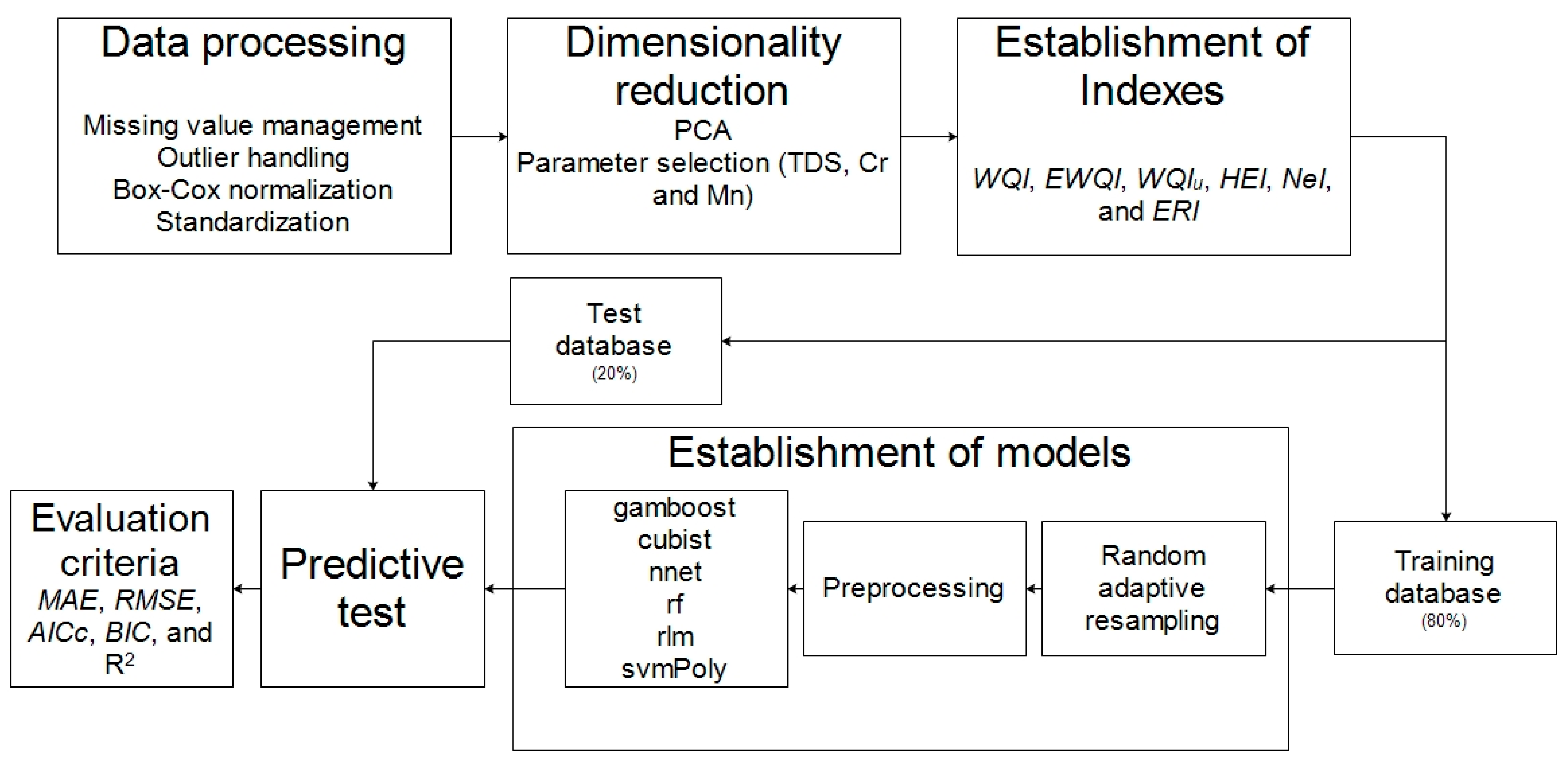 Process diagram. , water quality index; , entropy weighted water quality index; , unified water quality index; , heavy metal evaluation index; , nemerow index; , ecological risks of heavy metals; TDS, total dissolved solids; Cr, crome; Mn, manganese; gamboost, boosted generalized additive model; cubist, decision trees and multiple linear regression methods; rf, random forest; nnet, neural network; rlm, robust linear model; svmPoly, support vector machines with polynomial kernel; , mean absolute error; , root mean square error; , Akaike information criterion corrected; , Bayesian information criterion; R2, coefficient of determination.
