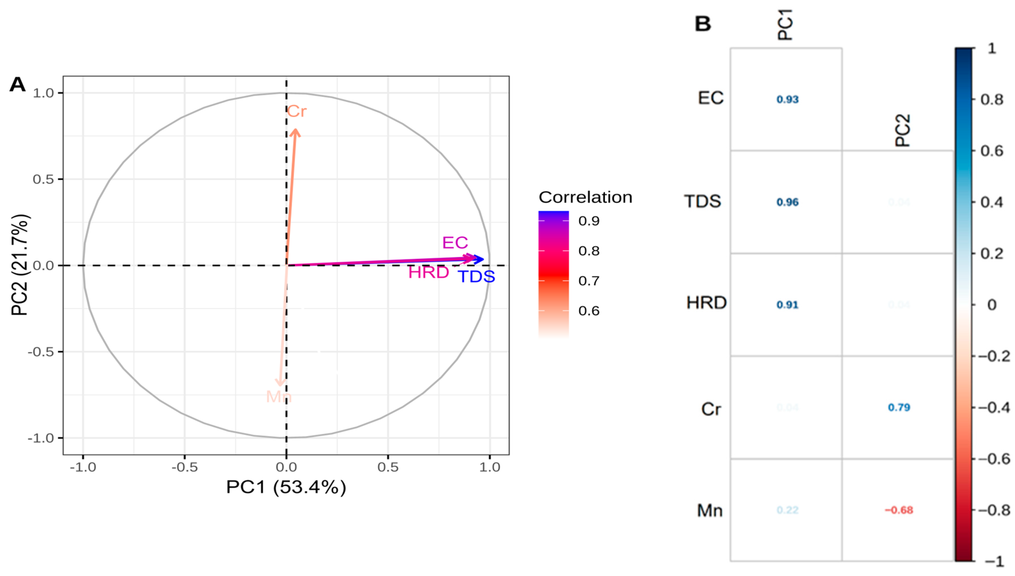 Bi-graph of PCs (A) and Spearman correlation matrix of indicators and PCs (B). PCs, principal components; EC, electrical conductivity; TDSs, total dissolved solids; HRD, hardness; Cr, chromium; Mn, manganese.