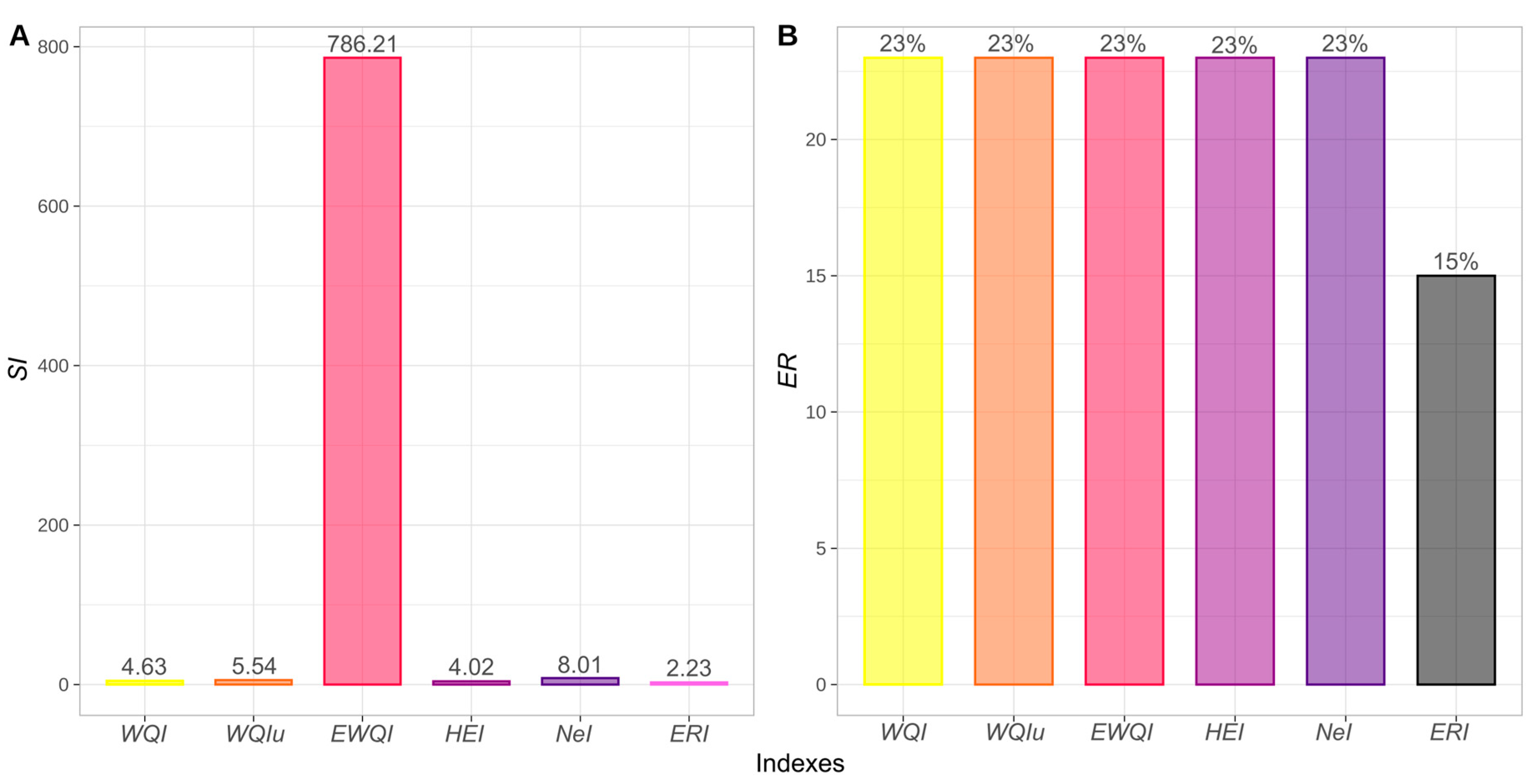 Sensitivity index (A) and efficiency rate index (B) of developed quality indices. , water quality index; , entropy weighted water quality index; , unified water quality index; , heavy metal evaluation index; , nemerow index; , ecological risks of heavy metals in groundwater.