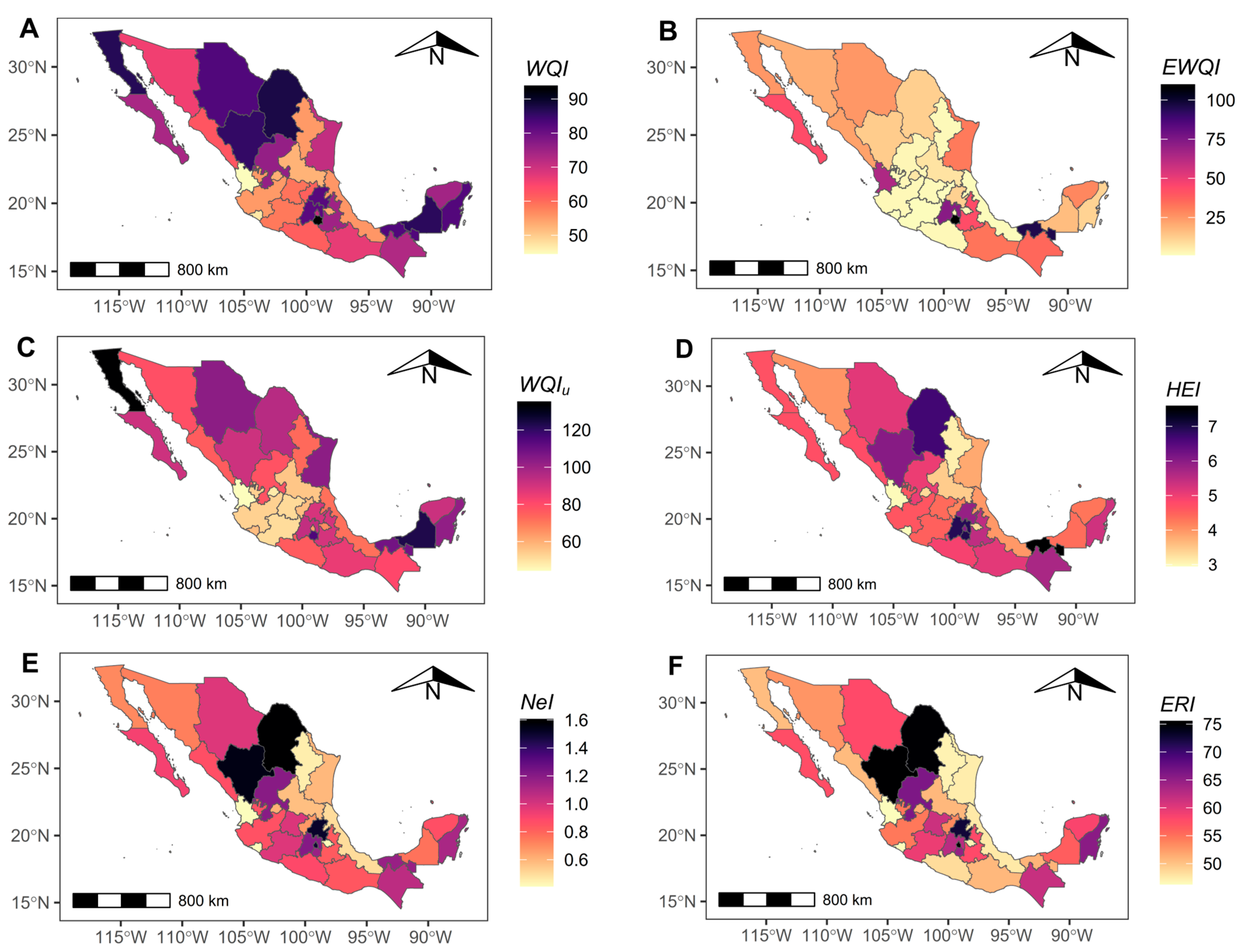 Spatial distribution of quality values of developed quality indices. (A) , water quality index; (B) , entropy-weighted water quality index; (C) , unified water quality index; (D) , heavy metal evaluation index; (E) , nemerow index; (F) , ecological risks of heavy metals in groundwater.
