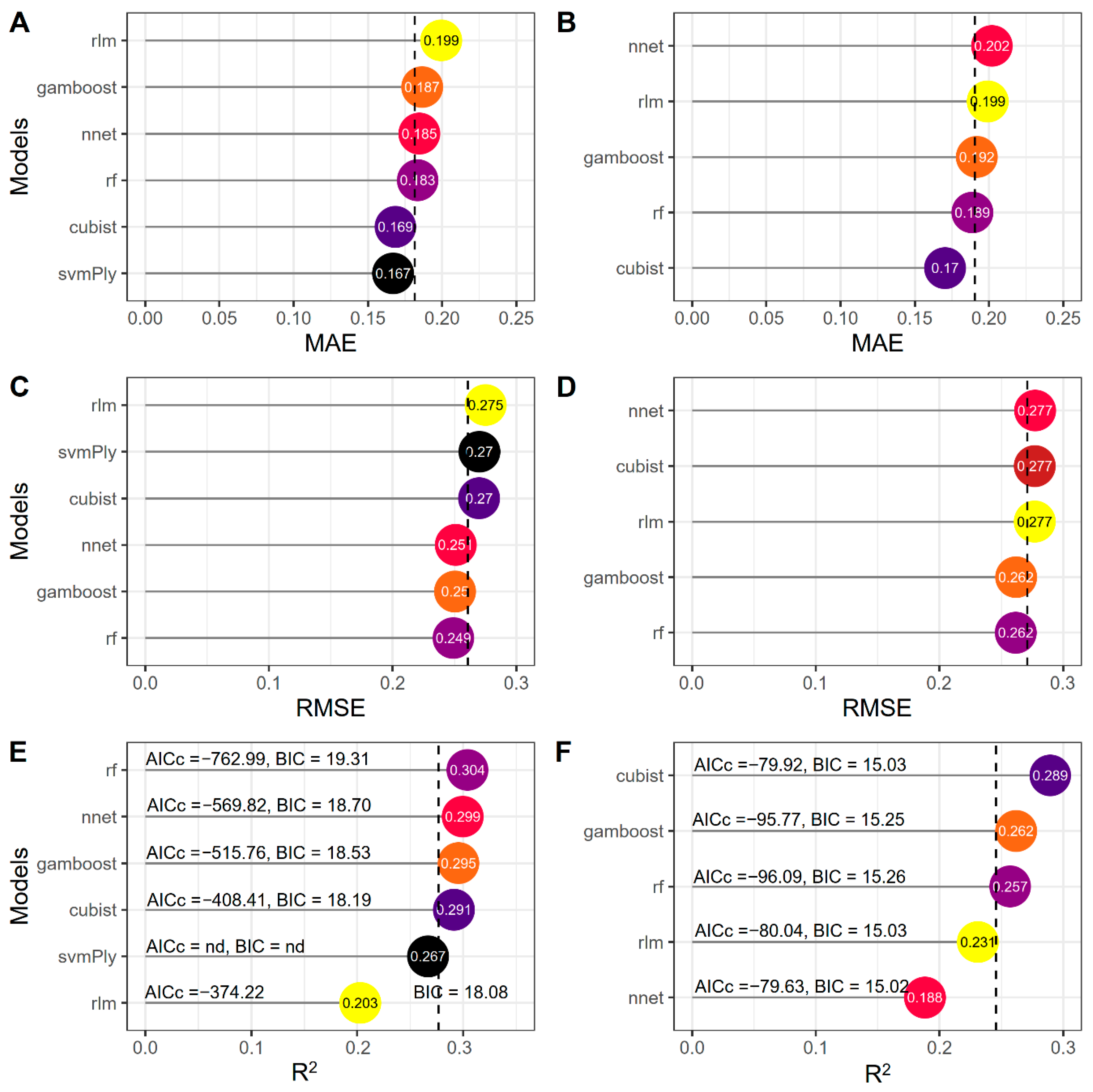Evaluation criteria for the ML models developed for the . (A,C,E), training stage criteria. (B,D,F), evaluation stage criteria. , heavy metal evaluation index; gamboost, boosted generalized additive model; cubist, decision trees and multiple linear regression methods; rf, random forest; nnet, neural network; rlm, robust linear model; svmPoly, support vector machines with polynomial kernel; , mean absolute error; , root mean square error; , Corrected Akaike information criterion; , Bayesian information criterion; R2, coefficient of determination; Dotted line, mean value of the criterion.