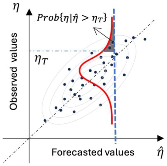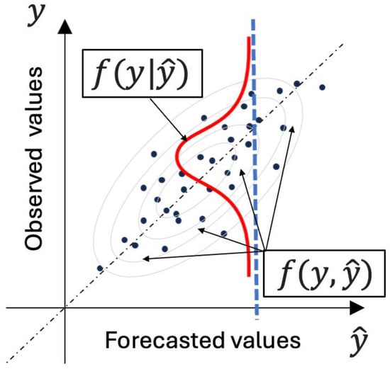 Let us clarify this concept of the “predictive density” using the following Figure 2, where the observed value is plotted as a function of its forecast . The cloud of black dots, in the case of a single model forecast, represents the shape of the joint distribution of observations and forecasts, as outlined by the grey ellipses. If we know a forecast value, we can then cut this joint distribution and renormalize it to obtain , the probability distribution of conditional on the known forecasted value (red in Figure 2). This concept can be generalized and extended to multiple models [] and to ensemble forecasts [] to become a flexible tool used in decision-making schemes. Please note that our interest is fully concentrated on the probability distribution of the true event , not on that of the model forecasts , because it will be the outcome of , not of , that will impact our decision.