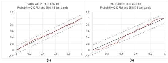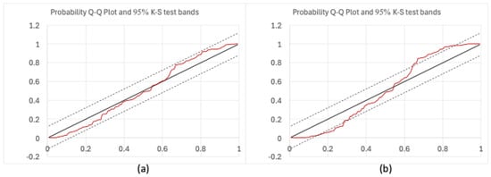 To assess the acceptability of the estimated predictive probability density [,], instead of using the traditional Kolmogorov–Smirnov (K-S) test, a probability plot with a histogram representation of the quantiles is recommended. The probability plot, also known as the Q-Q plot [], compares the cumulative distribution of standardized prediction error values to their empirical cumulative distribution function (Figure 3).