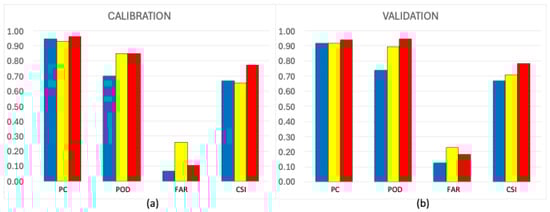The evaluation is carried out using contingency matrices and the estimation of synthetic indices, which are widely used in the hydrological field [,]. The contingency table represents statistical classification accuracy, with each column containing predicted values and each row containing actual values. For binary variables (e.g., true or false), the table cells will contain Hits (a), False alarms (b), Misses (c), and Correct rejections (d), as shown in Table 1.
