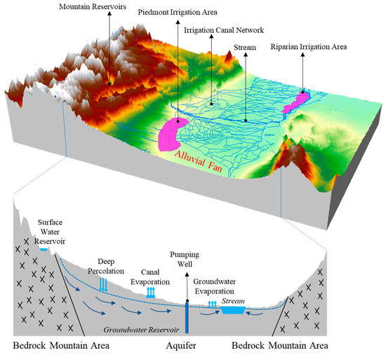 The hydrogeological setting of the basin shows clear spatial heterogeneity in both lithology and structure. In the middle oasis basin, located between the mountain front and the foreland of the alluvial fan, rivers have deposited large amounts of coarse-grained materials, creating favorable conditions for groundwater storage. The uplift of the Qilian Mountains led to the accumulation of alluvial fan and fluvial deposits, which mainly consist of unconsolidated Quaternary sediments. These deposits exhibit a south–north transition, with coarse gravels in the south gradually grading into medium- to fine-grained sands and silts toward the north [28,29,30].