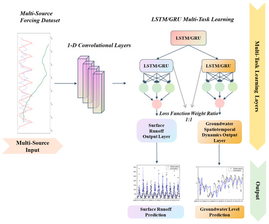 Meteorological, runoff, and groundwater spatiotemporal data are first processed by a shared 1D-CNN layer, in which high-dimensional spatial features are hierarchically extracted. These features are then passed to a second shared layer composed of either LSTM or GRU networks, where coupled temporal variation patterns between groundwater dynamics and river runoff are captured. Subsequently, two task-specific recurrent modules (LSTM or GRU) further refine temporal representations for groundwater-level dynamics and surface runoff, respectively, before fully connected layers generate the final predictions.