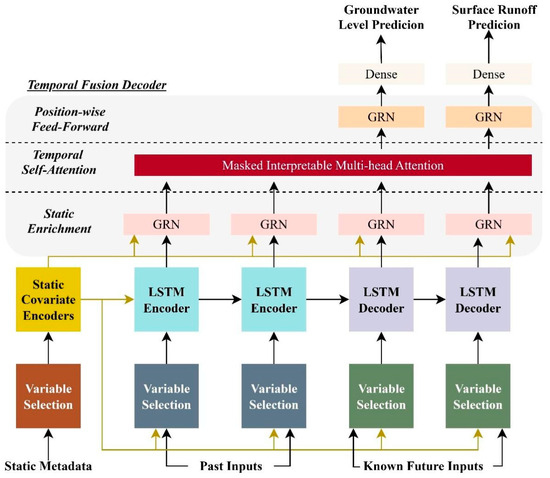 In this study, the Temporal Fusion Transformer (TFT) model developed by Lim et al. (2021) [47] is adopted as an interpretable, multivariate time-series forecasting approach within a multi-task learning framework for regional surface water–groundwater coupling simulation. TFT combines the representational capacity of the Transformer architecture with components specifically designed for time-series analysis, enabling the explicit integration of temporal variations and contextual information from historical observations to produce multi-horizon forecasts [48,49,50,51,52]. Its key advantages include (1) a Transformer-based self-attention mechanism that captures long-range dependencies in the input sequence—an approach widely used in natural language processing and increasingly in time-series analysis, yet rarely explored in hydrology and groundwater studies; (2) an interpretable fusion mechanism that integrates diverse temporal and contextual features to enhance model transparency; (3) a multi-step forecasting design optimized for simultaneous prediction of multiple future time points; and (4) the generation of probabilistic forecasts alongside point estimates, allowing uncertainty quantification and improving the reliability of simulation outputs.