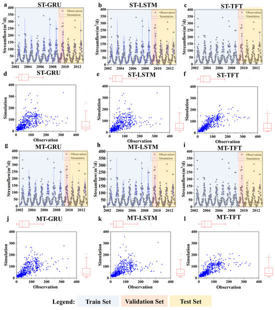 Six proposed models’ simulation results for runoff in HRB: Streamflow simulation results of (a) ST-GRU, (b) ST-LSTM, (c) ST-TFT, (g) MT-GRU, (h) MT-LSTM, and (i) MT-TFT; Scatter plot of observation and simulation results of (d) ST-GRU, (e) ST-LSTM, (f) ST-TFT, (j) MT-GRU, (k) MT-LSTM, (l) MT-TFT. TFT achieved the best overall performance in both STL and MTL.