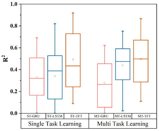 Under the MTL framework, accuracy improved for TFT and LSTM but declined for GRU. The MT-TFT reached median/mean R2 = 0.52, the MT-LSTM attained 0.49/0.43, and the MT-GRU fell to 0.29/0.30. These results highlight two consistent patterns: TFT consistently outperformed LSTM and GRU in both frameworks, reflecting its architectural advantage, and incorporating surface runoff as an auxiliary task enhanced TFT and LSTM performance, demonstrating MTL’s effectiveness in capturing surface–groundwater interactions in hydrologically complex basins.