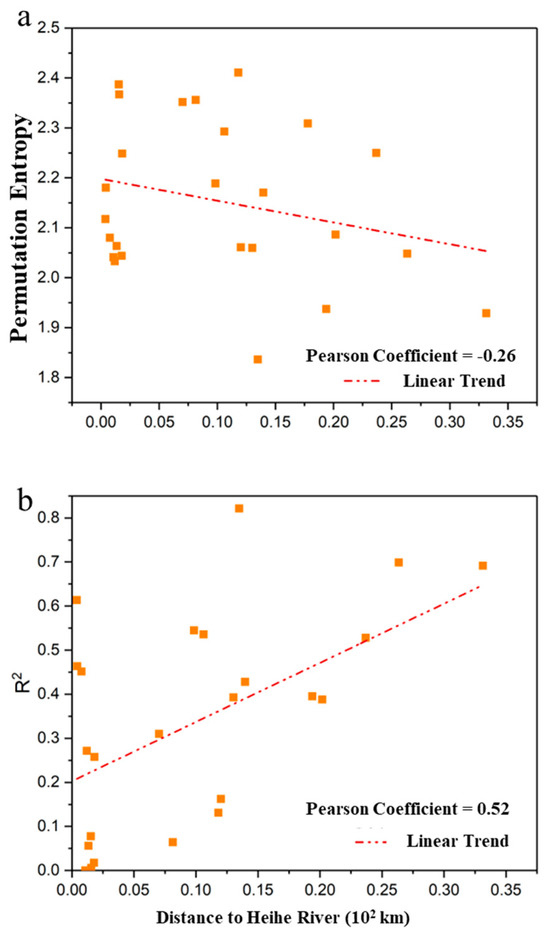 Relationship of the distance to HRB with the groundwater modeling performance: (a) Permutation Entropy and (b) R2.