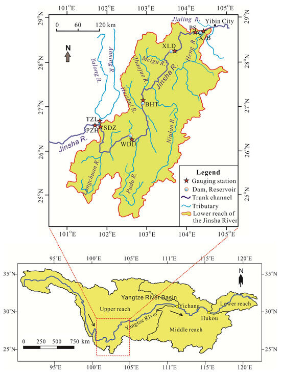 The Yangtze River originates from the Qinghai–Tibet Plateau, flows from west to east, and empties into the East China Sea (Figure 1). It has a total length of approximately 6397 km and a total drainage area of 1.8 × 106 km2. Taking the Yichang and Hukou hydrological stations as boundaries, the Yangtze River is divided into three reaches: the upper reach with a length of 4504 km, the middle reach with 955 km, and the lower reach with 938 km. Since 1950, more than 50,000 reservoirs of various types have been built in the Yangtze River Basin [3], with a total storage capacity exceeding 83 × 109 m3. Among them, the upper reaches of the Yangtze River are a “rich mining area” for hydropower resources. The world’s largest Three Gorges Dam is located at the downstream end of the upper Yangtze River, with a storage capacity as high as 39.3 × 109 m3.