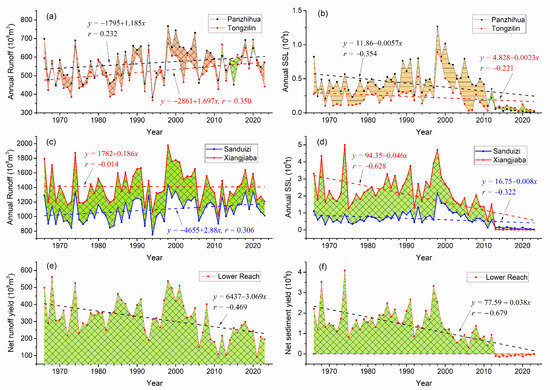 For the studied river reach (between Sanduizi and Xiangjiaba Stations), both the annual net runoff yield and annual net SSL showed decreasing trends (Figure 2e,f), with average decreasing rates of 3.069 × 108 m3·yr−1 and 3.8 × 106 t·yr−1, respectively.