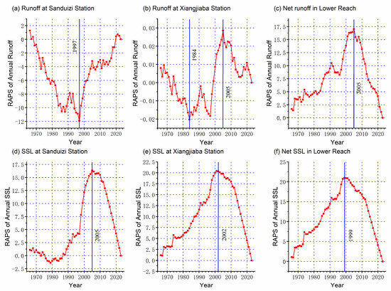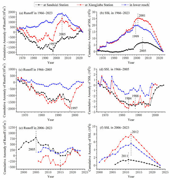 The cumulative anomaly curves of annual runoff and annual SSL from 1966 to 2023 at the hydrological stations at the inlet (Sanduizi Station) and outlet (Xiangjiaba Station) of the study area are shown in Figure 3. A main abrupt change in the runoff at Sanduizi Station occurred in 1997, with the trend shifting from a decreasing one before 1997 to an increasing one afterward (Figure 3a). A cross-check with the Mann–Kendall (M-K) trend test results confirms that this abrupt change year is statistically significant.