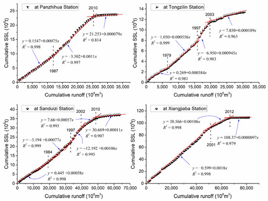 All deflections occurring before 2000 were characterized by the growth rate of cumulative SSL being greater than that of cumulative runoff, which was manifested as an overall upward deflection of the double mass curve. All deflections after 2000 were characterized by the growth rate of cumulative SSL being less than that of cumulative runoff, which was manifested as a downward deflection of the curve after the inflection point.